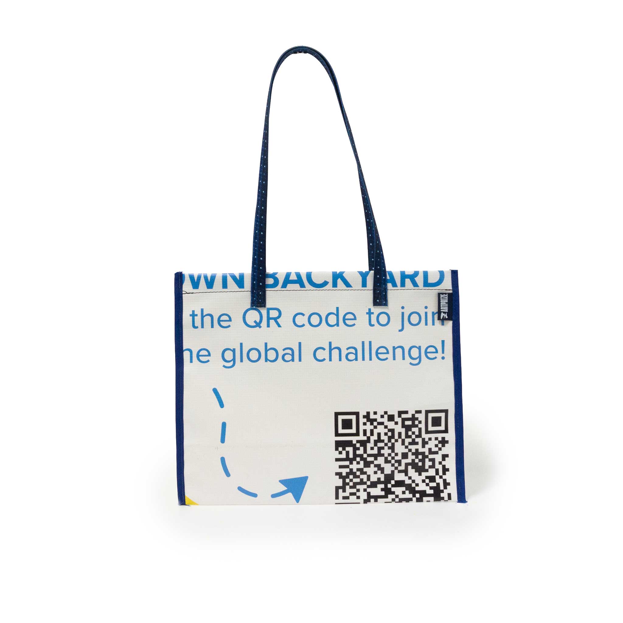 Upcycle your billboards or banners into is perfect pack flat, medium carry-all option for any event, promotional opportunity, give-away, or any other opportunity where you want to highlight your commitment to sustainability. As with all our billboard and banner products, every bag is a one-of-a-kind.