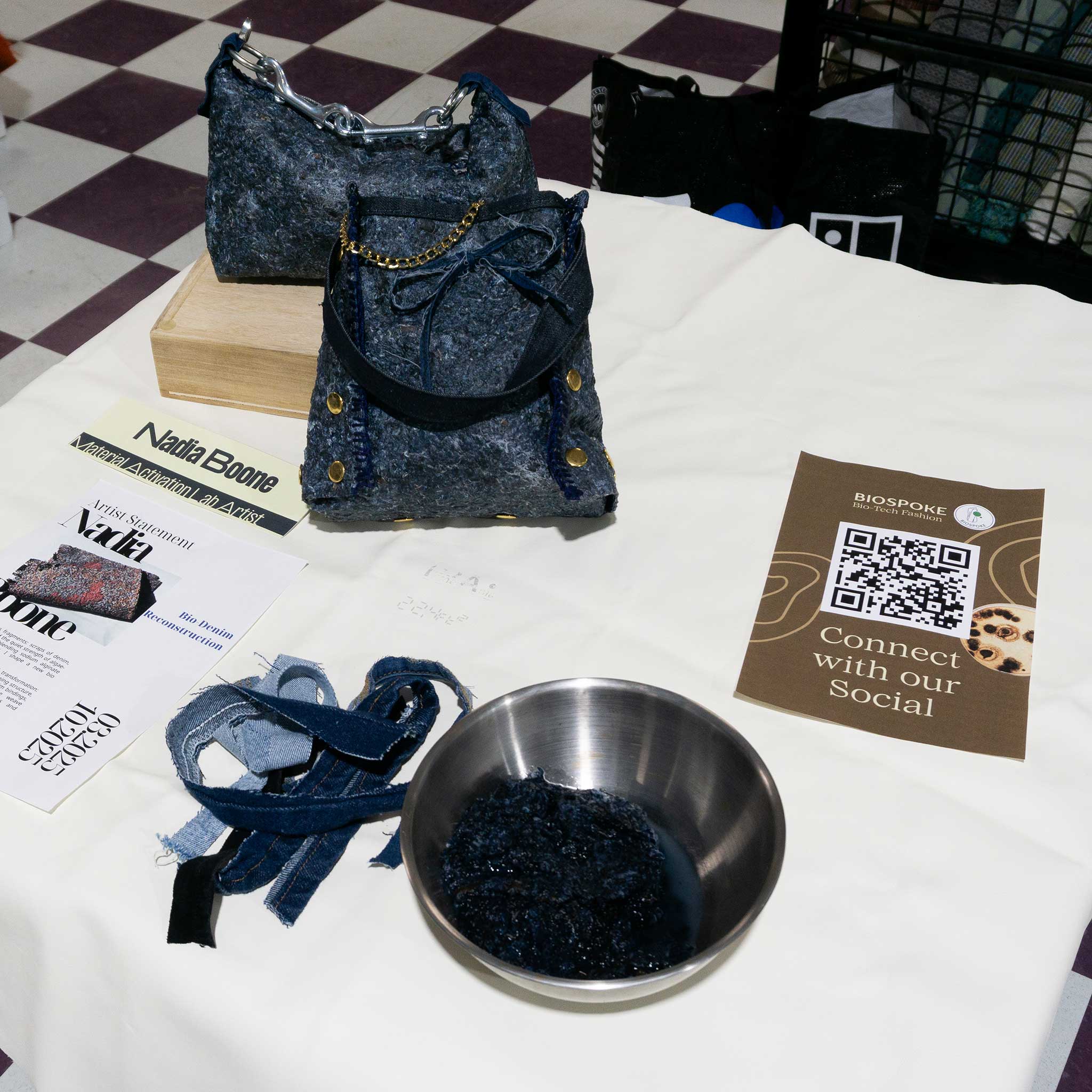 Nadia's concept explores how denim waste can be reborn through biomaterial innovation. By fusing post-consumer denim scraps with algae-derived binders, BIOSPOKE transforms discarded textiles into bespoke accessories!