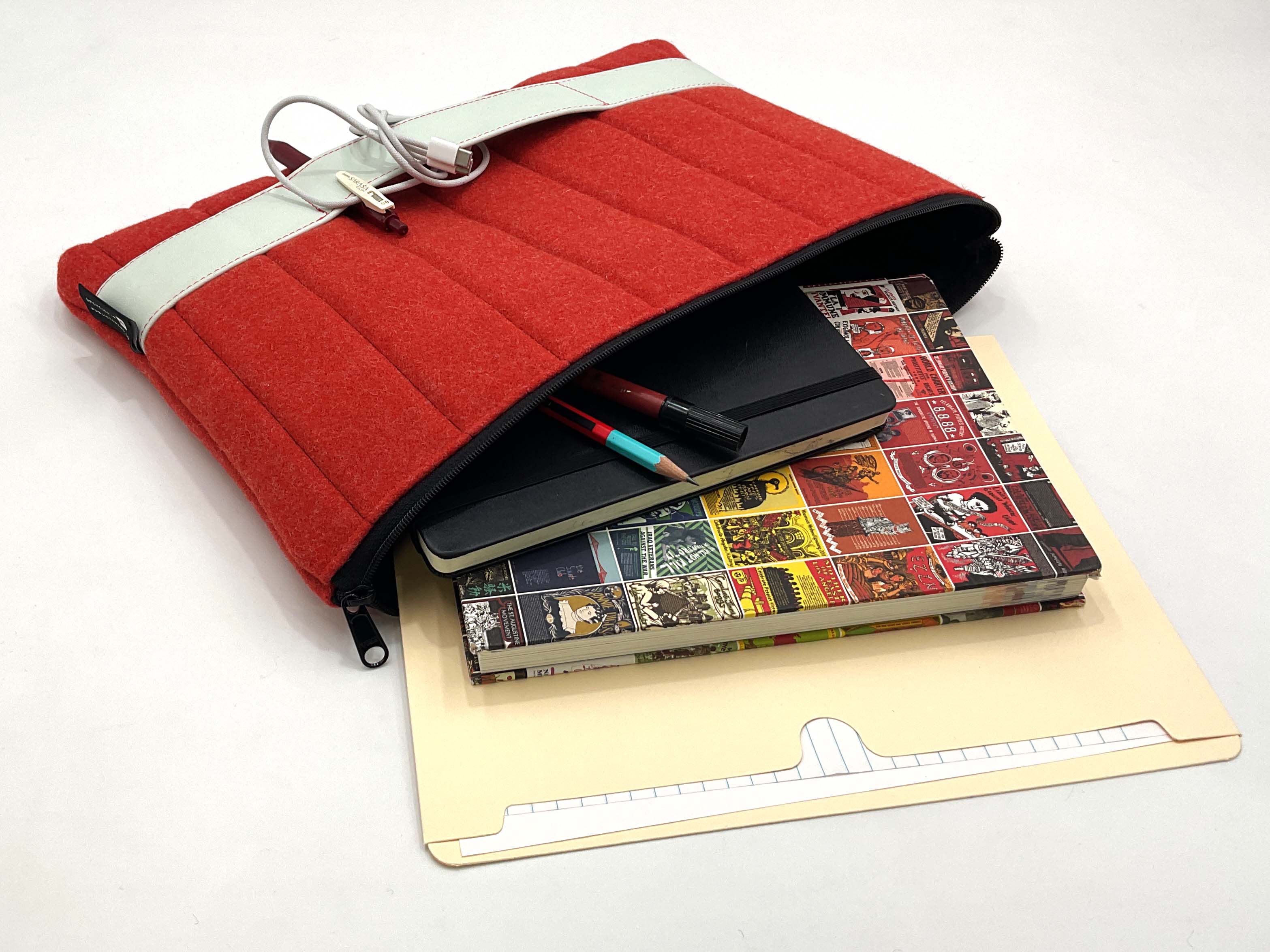 Say goodbye to boring laptop sleeves! Introducing our upcycled wool and leather laptop clutch. Made from super soft quilted wool and lined with smooth nylon, this clutch keeps your computer safe during day to day transport. The upcycled leather strap adds a touch of versatility and can fit anything you need for a night out after work. Stay organized while reducing your environmental impact! Fits most standard laptops.