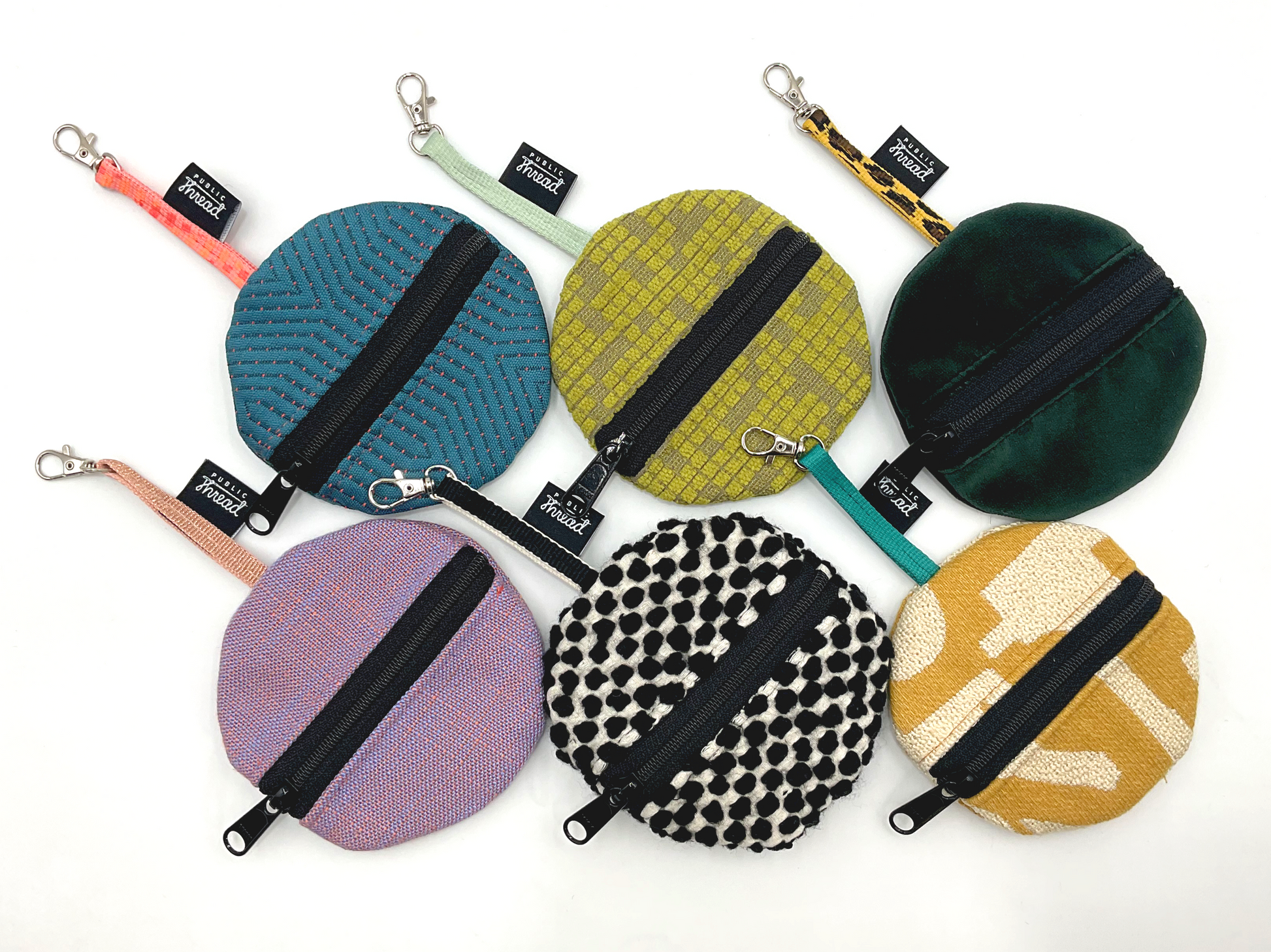 Add a stylish touch to any bag with our Round Bag Charm. Designed to clip easily onto your purse, backpack, or tote, this charming accessory provides a convenient place to store small essentials like coins, lip balm, cards, cash, or anything else you need to keep handy. Crafted from upcycled upholstery fabrics, it brings a unique tactile element to your bag while offering a secure zippered compartment for easy access to your items.