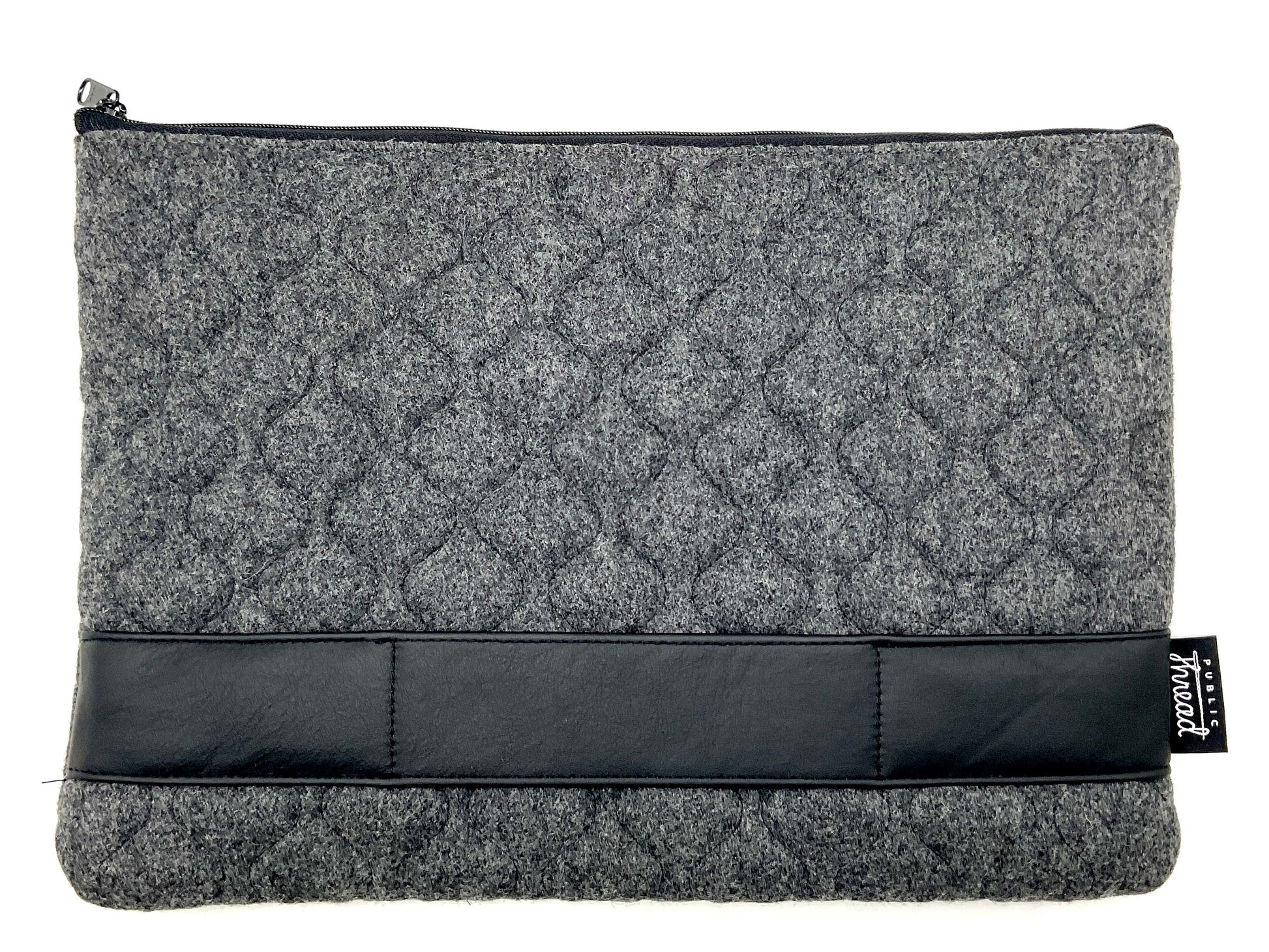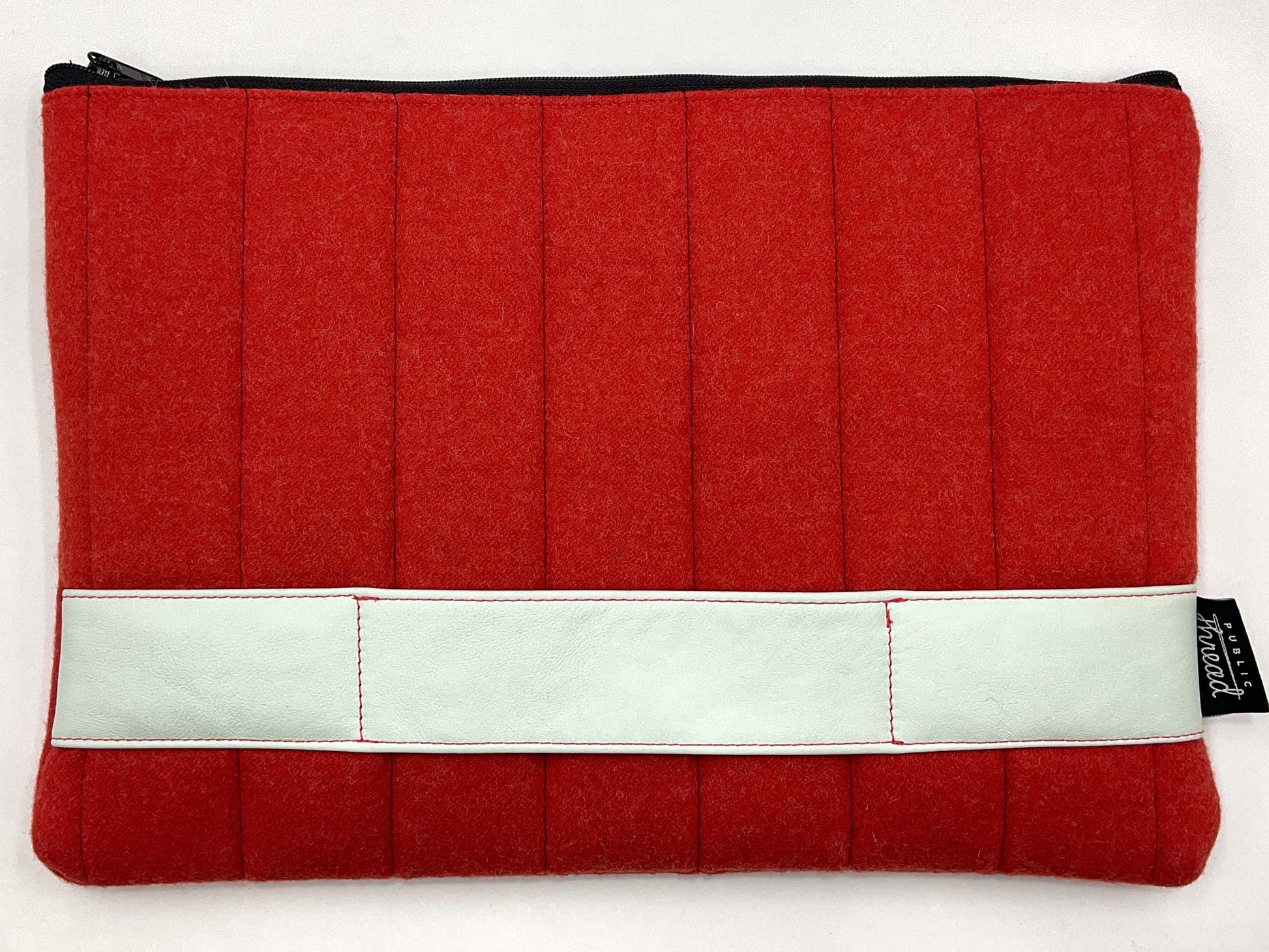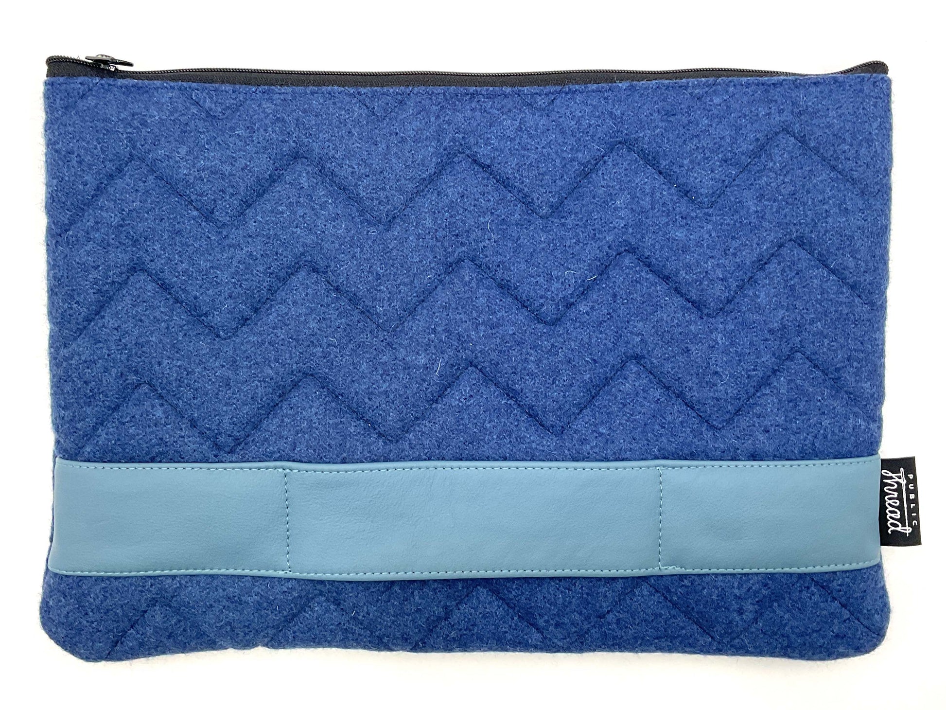 Say goodbye to boring laptop sleeves! Introducing our upcycled wool and leather laptop clutch. Made from super soft quilted wool and lined with smooth nylon, this clutch keeps your computer safe during day to day transport. The upcycled leather strap adds a touch of versatility and can fit anything you need for a night out after work. Stay organized while reducing your environmental impact! Fits most standard laptops.