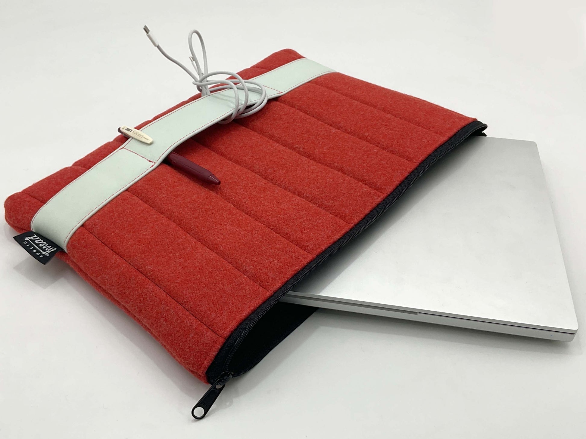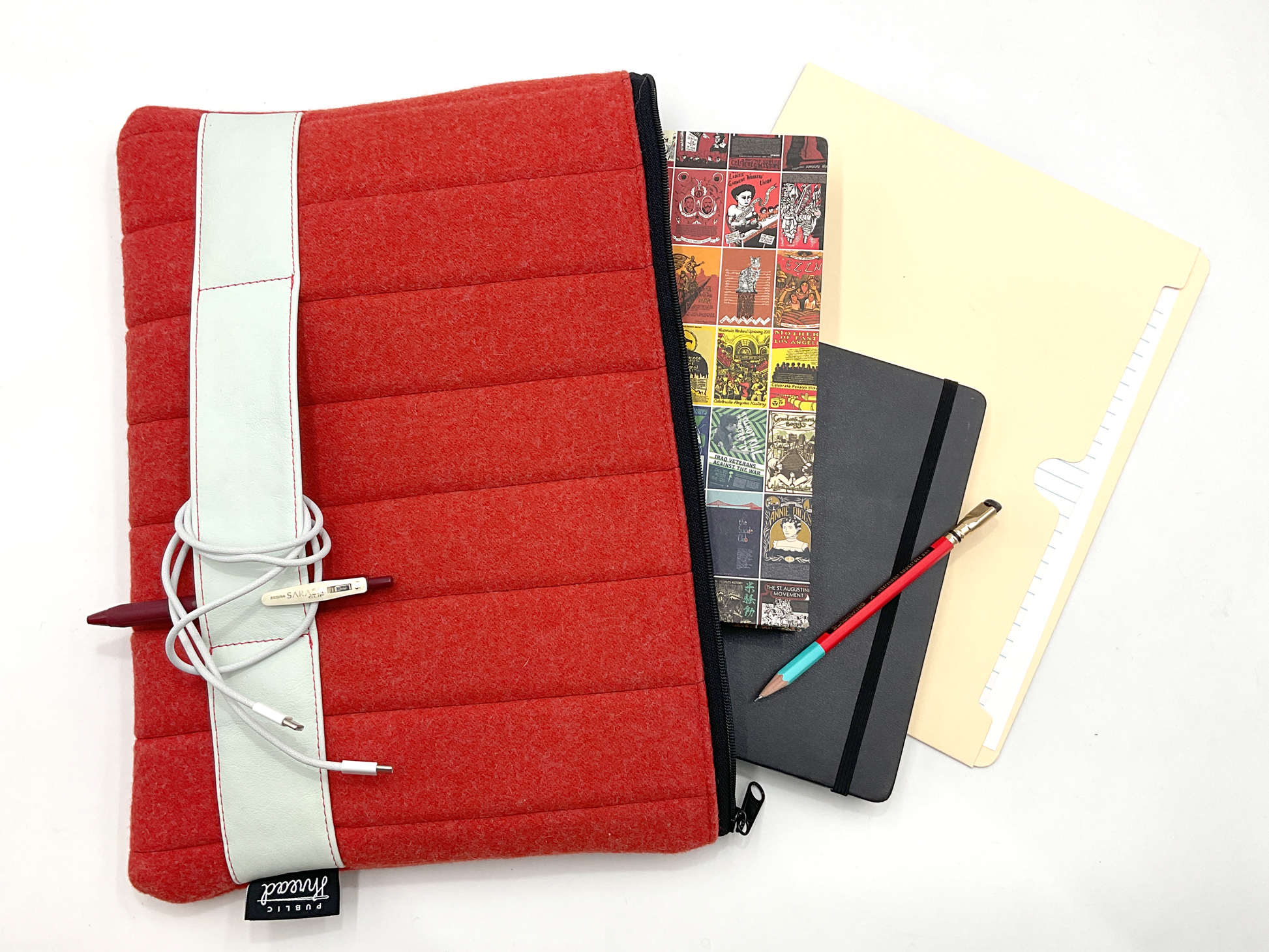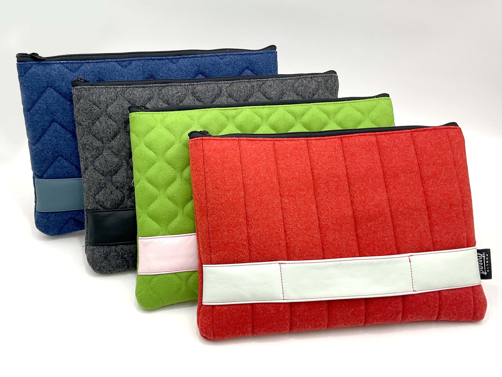 Say goodbye to boring laptop sleeves! Introducing our upcycled wool and leather laptop clutch. Made from super soft quilted wool and lined with smooth nylon, this clutch keeps your computer safe during day to day transport. The upcycled leather strap adds a touch of versatility and can fit anything you need for a night out after work. Stay organized while reducing your environmental impact! Fits most standard laptops.